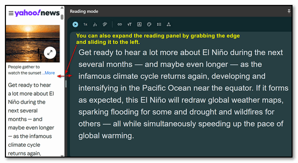 You can select any article on the page and open it in the new Reading Mode. You can also adjust the font, font-size, font-color, and more by using the toolbar at the top. You can also have the page read to you.