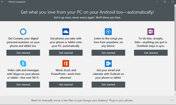 As you can see above – you can sync a lot of things between your Windows 10 PC and your Android device: Cortana, photos, music, to-do-lists (OneNote), Skype, MS Office, and Outlook Email. Now you may not have or want to sync all those things, we just wanted to be aware that your Window 10 PC and your Android device can play nice together. And if you have an iPhone or iPad, you have the same choices…see?