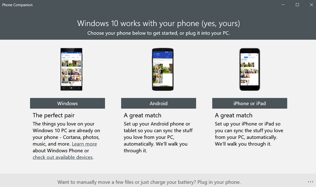 Open your start menu, type Phone Companion and click it when it comes up in search results. What’s that EB? Where do you type it in the Start Menu? Don’t worry about it. Just open your start menu and start typing, Windows knows what you are doing. Really! If you really need a form or blank area to type in, use the search on your taskbar and type Phone Companion. Either way you end up with Phone Companion open. As you can see from the image above, to sync your Android or Apple (iOS) device with your Windows 10 computer, just click the appropriate button. See? Android if you have an Android device and iPhone or iPad if you have an Apple device.