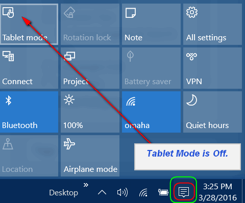 Just left of the clock (assuming your taskbar is at the bottom, if not you’ll get it) you’ll see an icon that looks like a callout or blurb or a shoutout – whatever. It’s circled in the screen shot above in green and red. See?  Click on this icon and you’ll see a menu. The items that are turned on are brighter than the ones that are turned off. (Yes, EB! Like a light bulb. Light bulbs are not very bright when they’re turned off – no go back and sit down, EB!) So if you click the icon (circled above) and you see “Tablet mode” is brighter than some of the tiles, then it’s turned on.